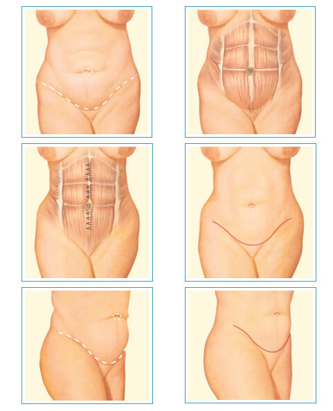 Bu operasyonda karın derisi kas üzerinden kaldırılarak aşağıya doğru gerilmekte fazlalıklar alınarak tekrar yerine dikilmektedir. Karın duvarındaki kaslar özel dikişlerle kendi üzerine katlanarak (plikasyon) veya gerekli hallerde özel bir destek doku (meş) ile takviye edilerek sıkılaştırılmaktadır. Karın duvarındaki- bel yanlarındaki fazla yağlar (özellikle üst karın kitle yapan yağlar) operasyonun başında liposakşın tekniği ile alınarak sonucun daha da iyi olması sağlanabilmektedir.